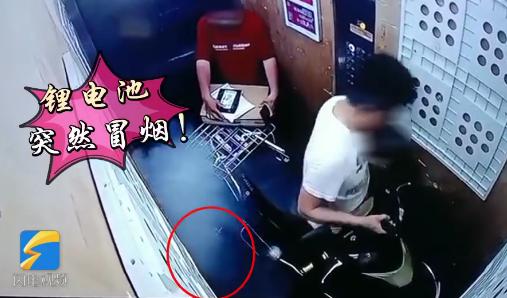 5月10日晚,安徽合肥市航空新城小區(qū)電梯里發(fā)生驚險一幕。從監(jiān)控視頻中可以看到,事發(fā)時,有一名男子推著電動車在電梯轎廂內(nèi),隨后電梯門打開,另一名男子拎著電動車鋰電池進入電梯。僅僅過了幾秒鐘,鋰電池突然冒