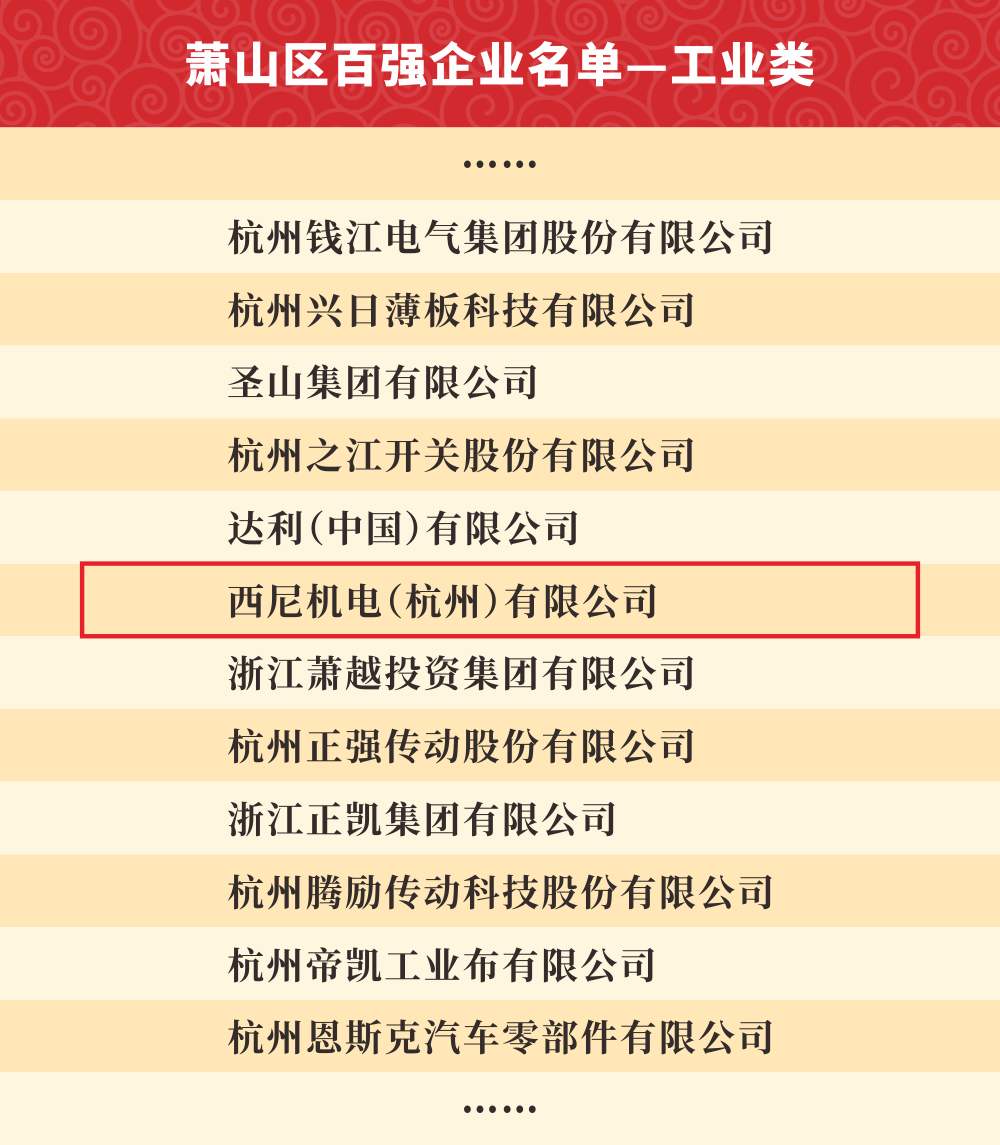 西尼機(jī)電多次入選“蕭山區(qū)百強(qiáng)企業(yè)”榜單。這一榜單是對我司綜合實(shí)力的展現(xiàn),也是對西尼發(fā)展的充分肯定和鼓勵(lì)。在未來,西尼仍將堅(jiān)持走高科技、高技術(shù)、創(chuàng)新化、高品質(zhì)的國際化發(fā)展道路,不忘初心,砥礪前行,實(shí)現(xiàn)更高的經(jīng)濟(jì)價(jià)值和社會價(jià)值。