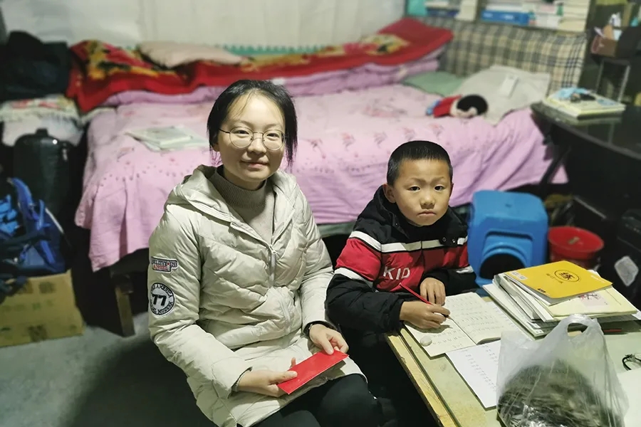 走訪的第一戶學(xué)生,小雪同學(xué)父親在2014年因病去世,家里剩下媽媽和弟弟,一家三口在不足10平米的房間里起居生活。我們到的時候,弟弟正彎著身子趴在飯桌上一筆一劃地練字。輕松交談間,姐弟倆肖似的相貌在金黃昏暗的燈光映襯下格外溫柔